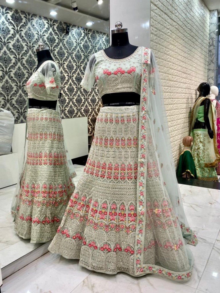 Look beautiful wearing this flared Sage Green Lehenga with floral embroidery, accompanied by a matching choli and a net dupatta with embroidery on borders. Slight color variation may occur due to photographic reasons.