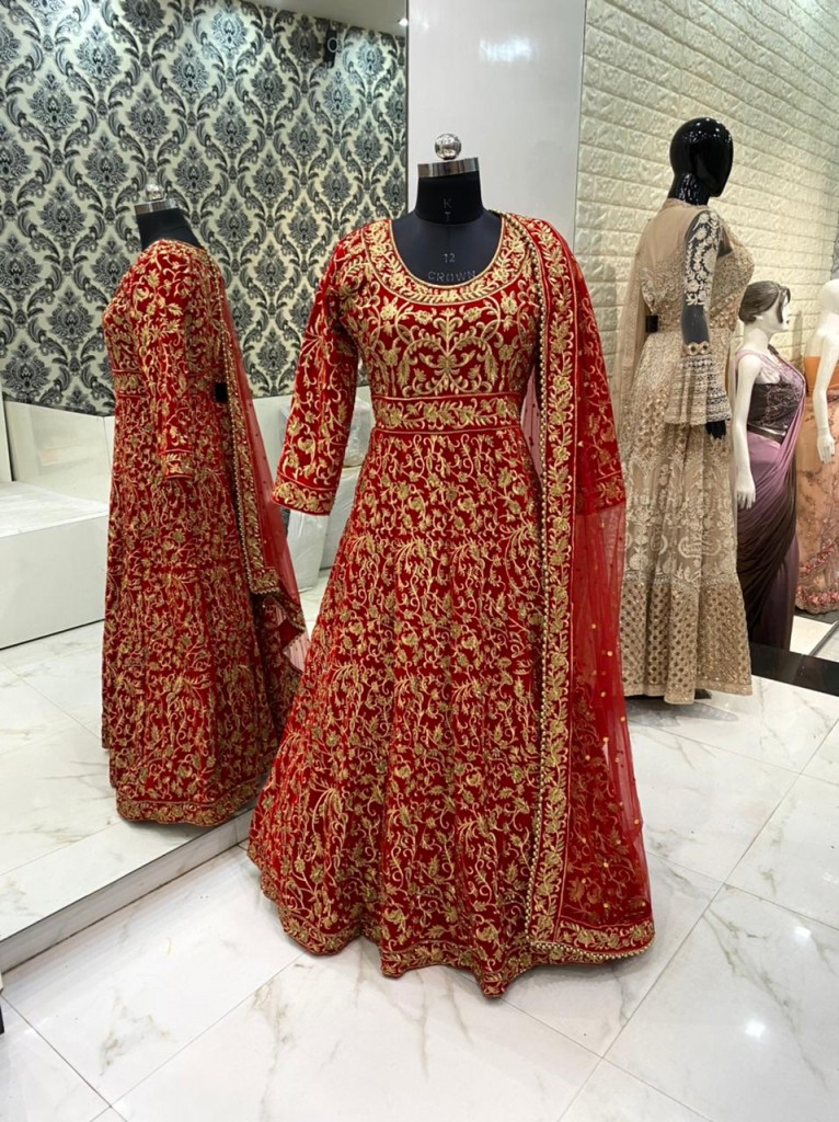 This product consists of a Red Bridal Gown accompanied by a matching net dupatta.