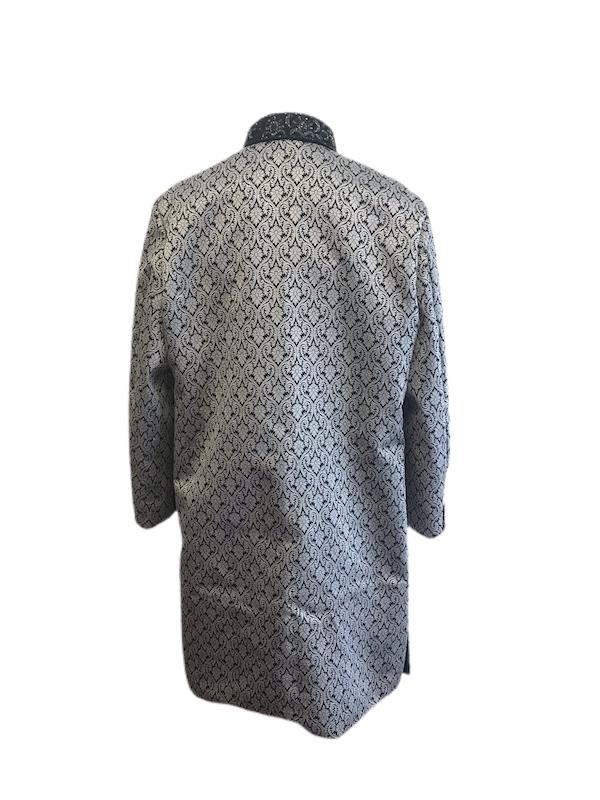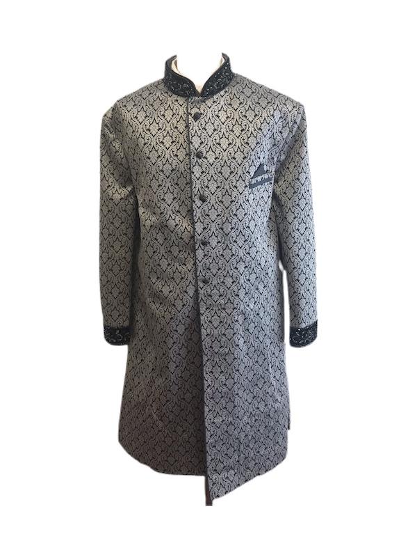 Silver-Black Brocade Sherwani with Black Hand Embroidery on collar and cuffs.