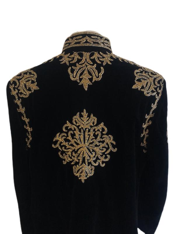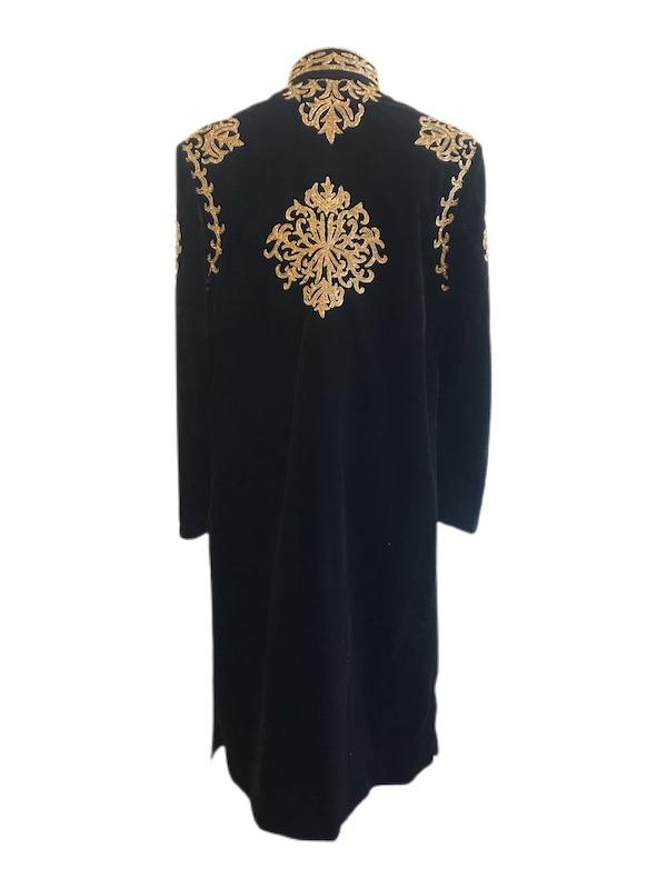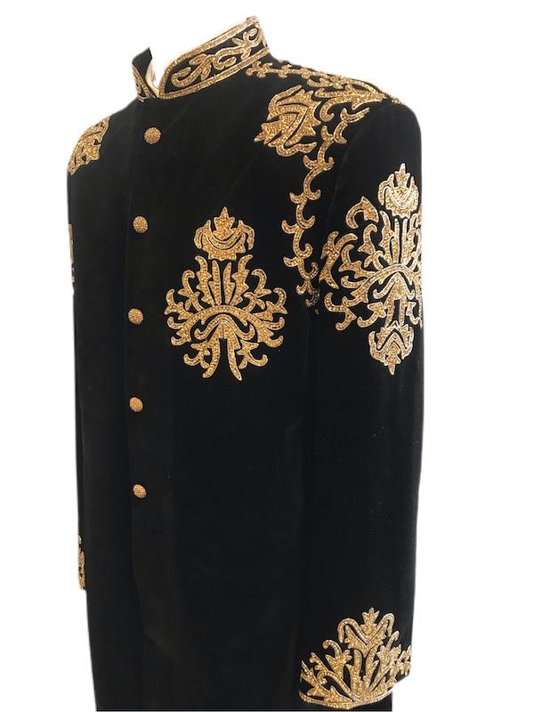 Black Velvet Sherwani with Antique Gold Hand-embroidery on chest, collar, shoulders and back.