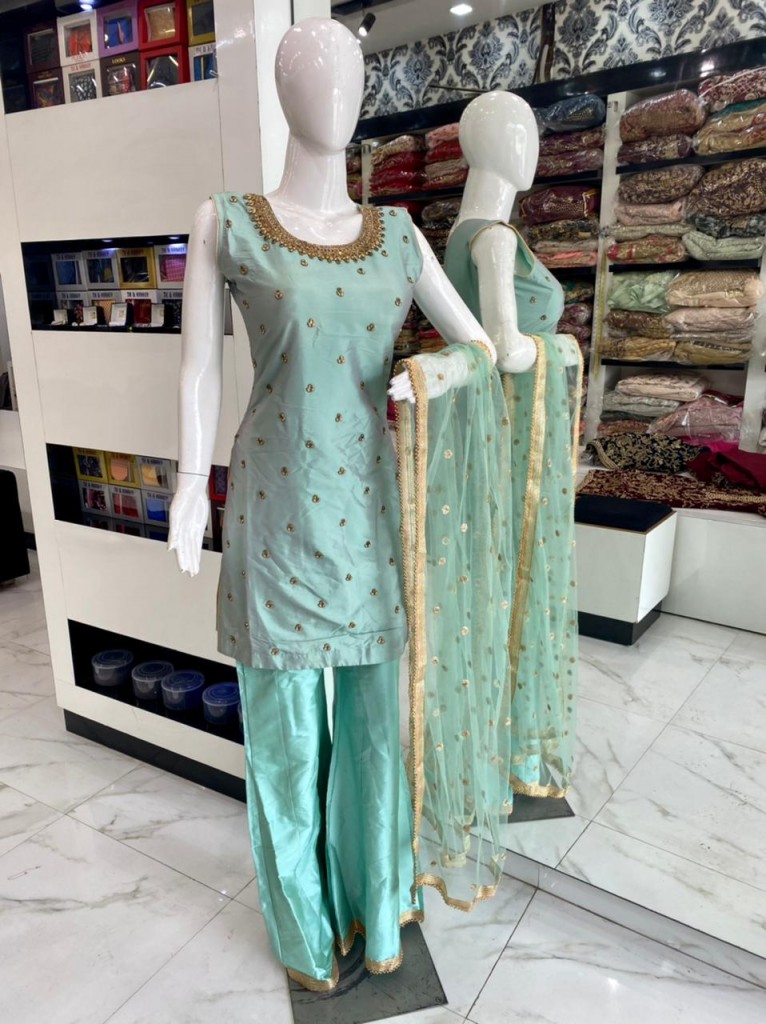 Mint trouser suit with embroidered neckline accompanied by a net dupatta with gold embroidery on borders.