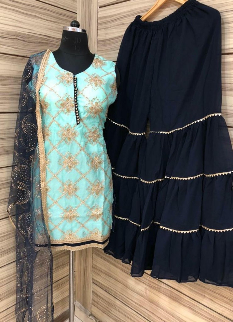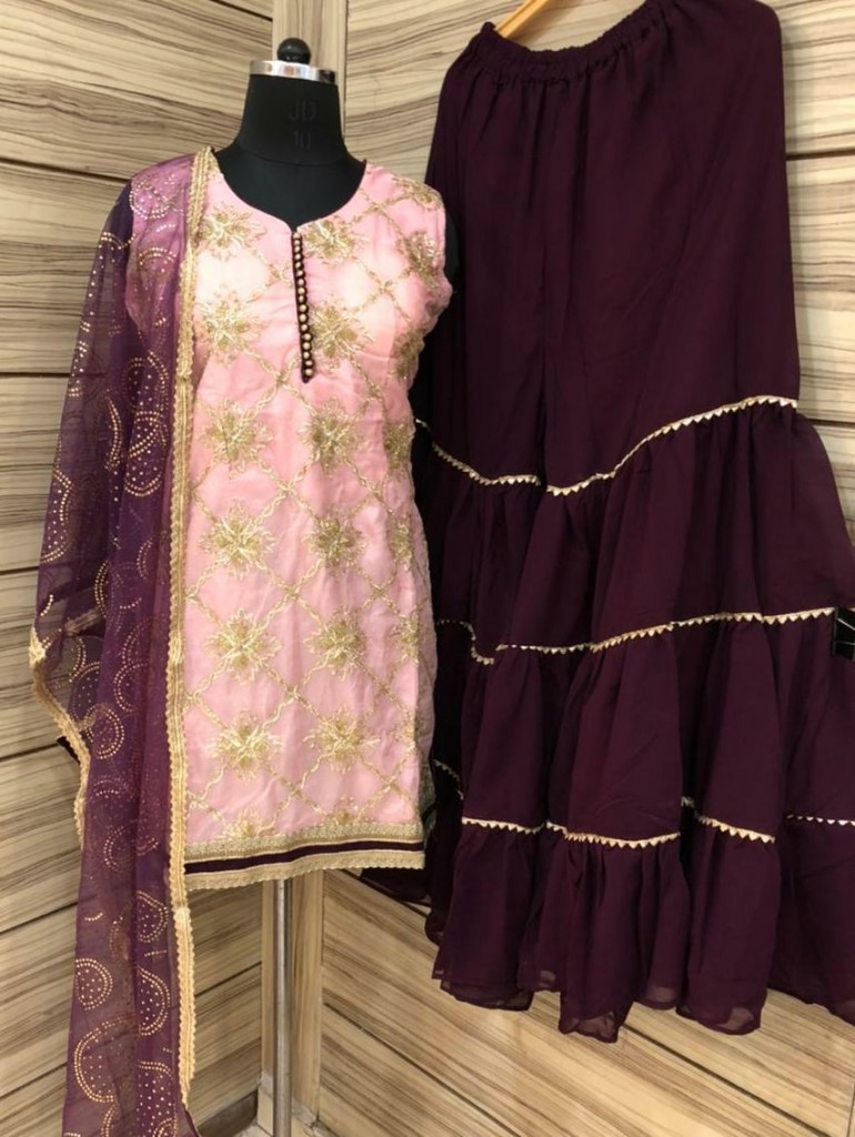 This product consists of a stitched red georgette sharara, white Kameez and net dupatta.