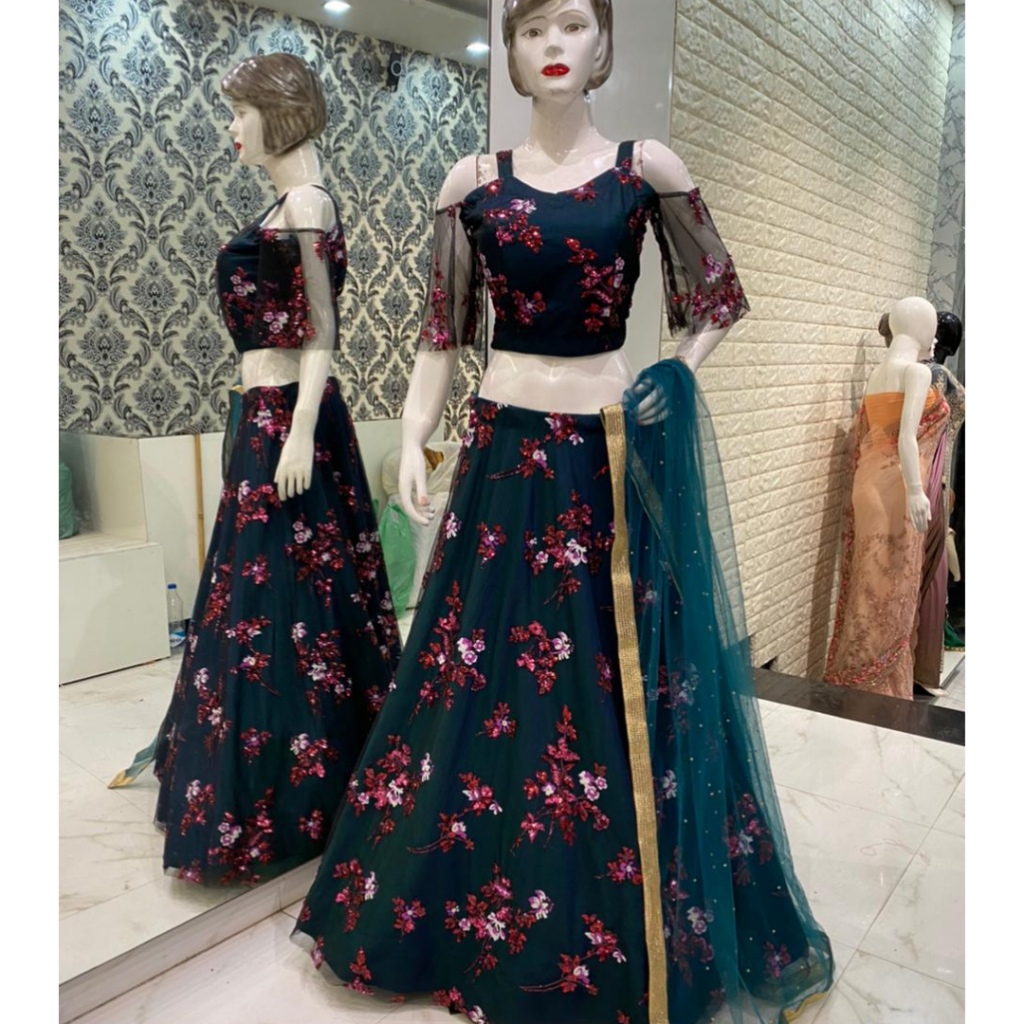 Dark Green Lehenga Choli with Floral Motif accompanied by a matching net dupatta.