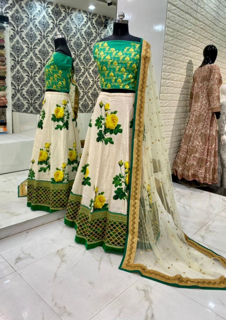 Floral Print Lehenga Choli accompanied by a green choli and a white base lehenga and a matching dupatta.