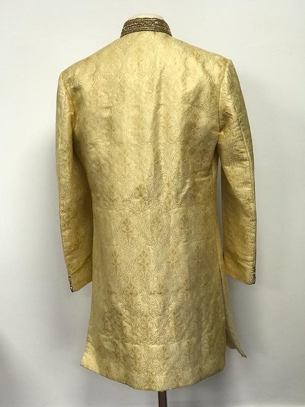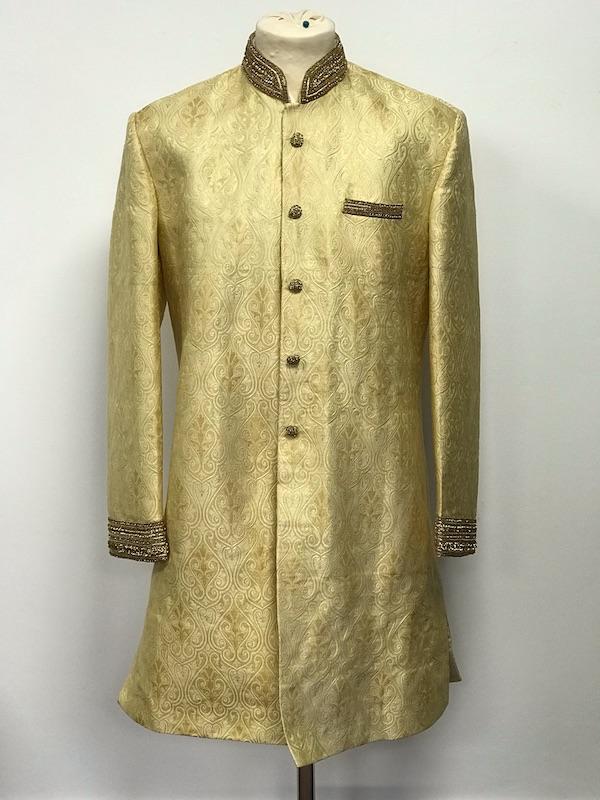Gold Brocade Sherwani with stonework on collar, cuffs, pocket and front opening.