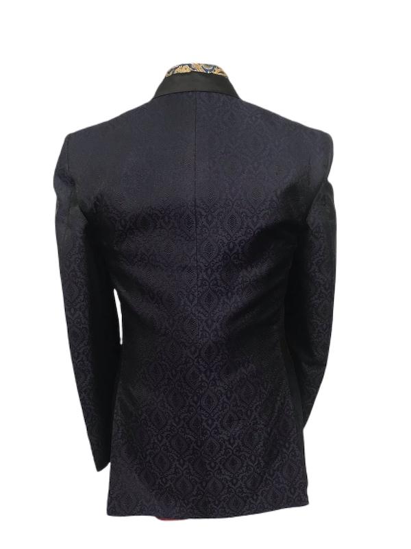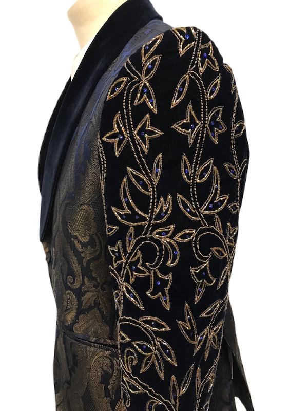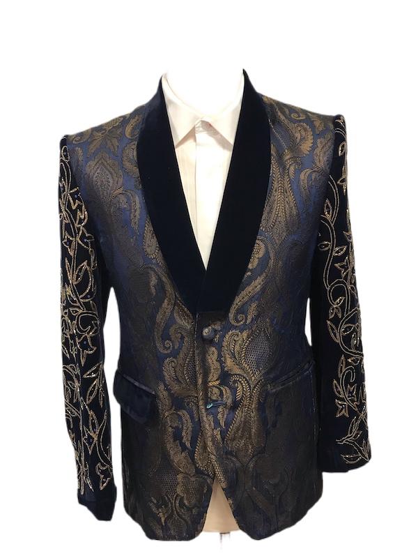 Navy Blue-Bronze Brocade Blazer with Velvet full Hand Embroidered sleeves & lapels.