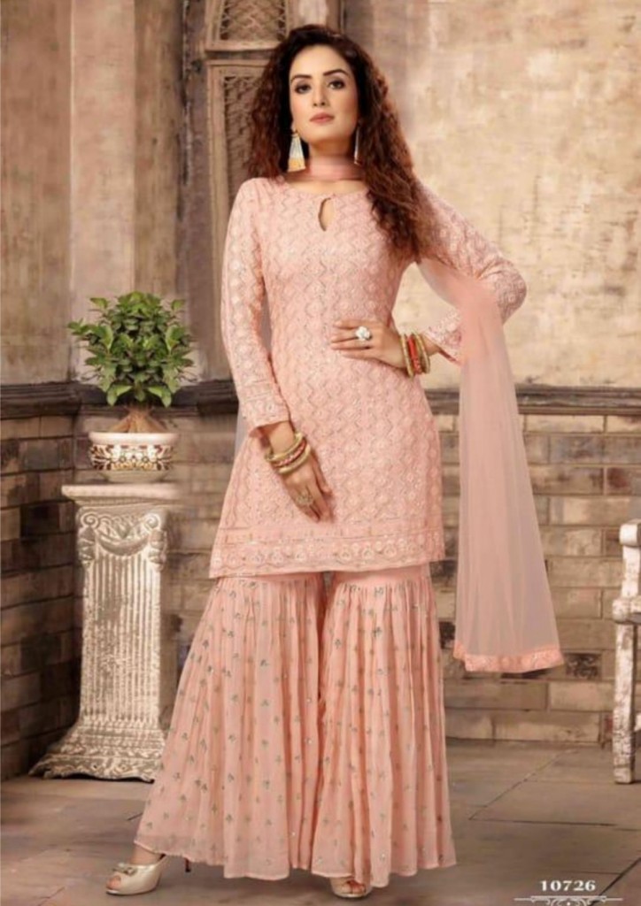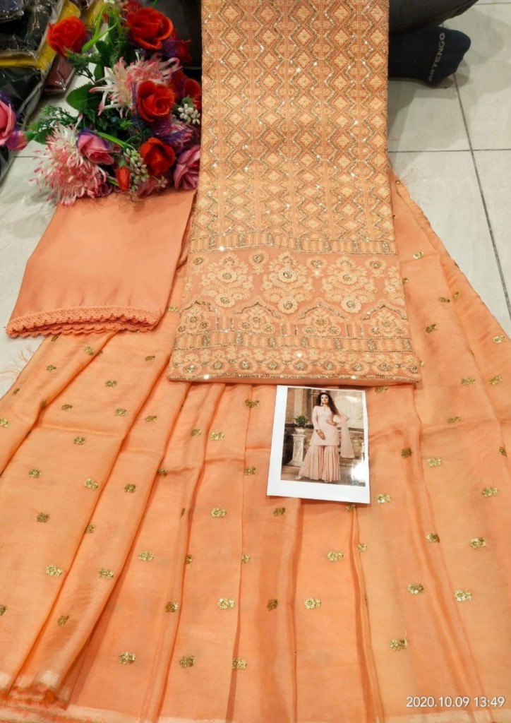 Featuring a Pastel Peach 3 Piece Suit accompanied by a matching embroidered Kameez-Tunic and a matching net dupatta. Slight color variation may occur due to photographic reasons.