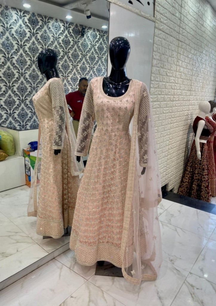Look beautiful wearing this flared Pink Maxi Gown with silver embroidery accompanied by net sleeves and a net dupatta. Slight color variation may occur due to photographic reasons. Please Note: This product is not available for next day delivery. See images for size guide.