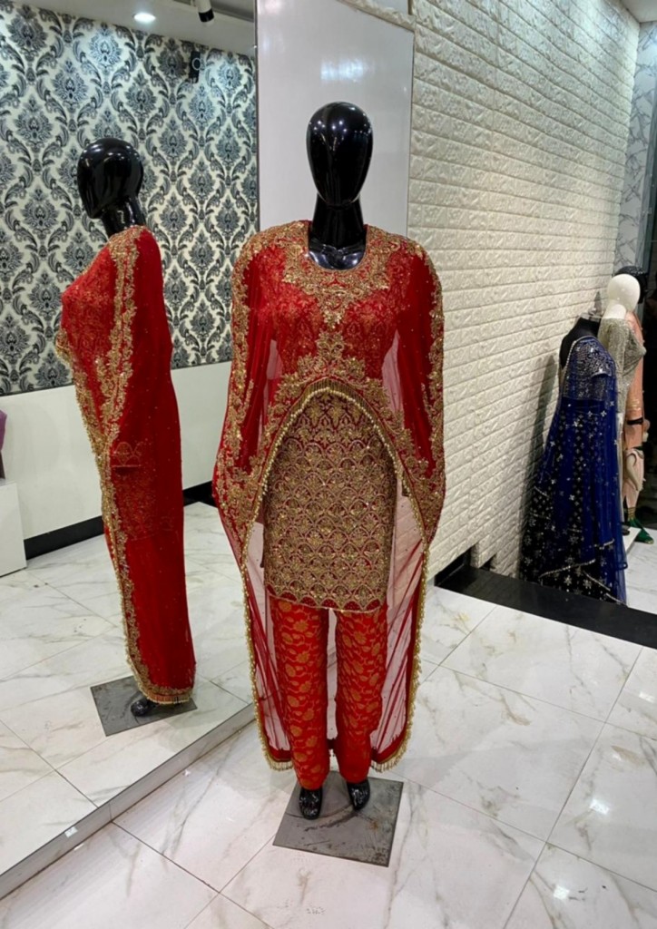 Red Bridal Embroidered Trouser Suit with gold embroidery all over, accompanied by a stitched net dupatta.